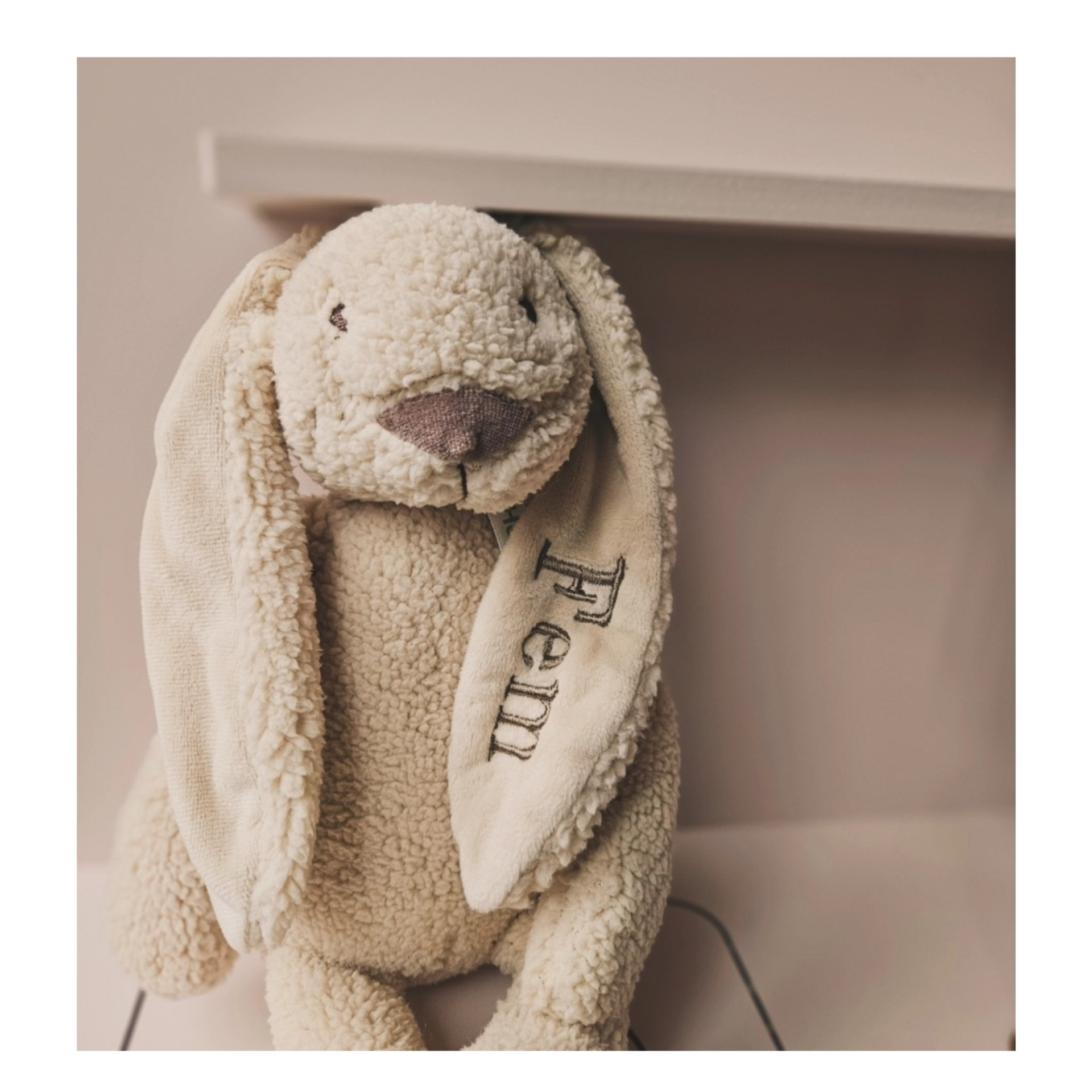 De borduring is zichtbaar aan de achterkant van het oortje en er past maximaal ƩƩn naam (tot 10 letters). Geef je twee namen of meer op, dan borduren we alleen de eerste naam. De naam komt op de teddy/pluisstof van het konijntje. Omdat dit geen vlak oppervlak is, kan de borduring oneffenheden bevatten.
