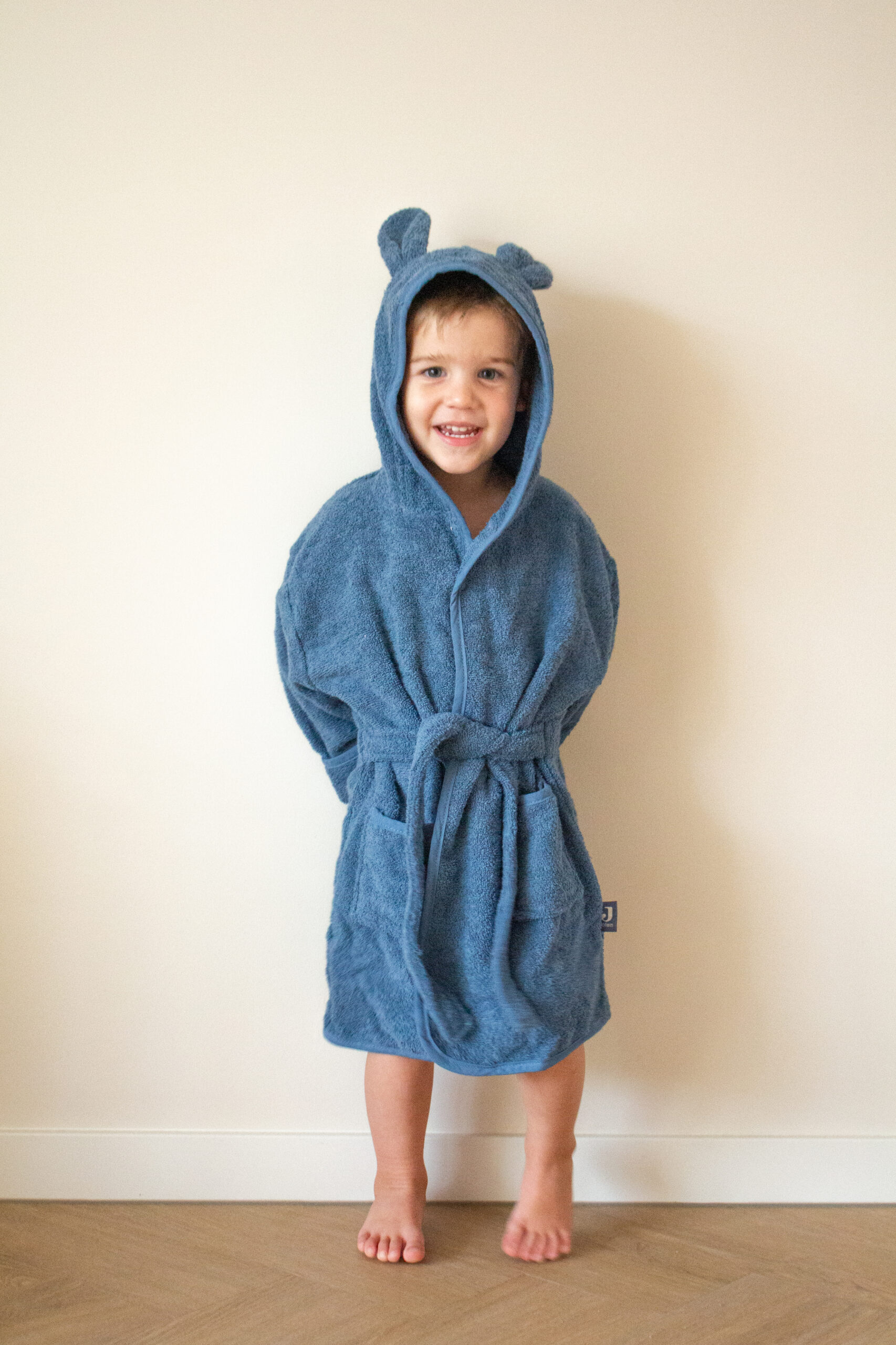 Hoe leuk is dit badjasje? De badjas is perfect om te gebruiken na het badderen, douchen of zwemmen. De zachte badstof neemt gemakkelijk water op en houdt daarmee jouw kleintje lekker warm. De vrolijke capuchon met oren droogt gemakkelijk de haartjes. Het badjasje is ook handig om mee te nemen op vakantie of mee naar een logeerpartijtje. Het badjasje heeft een handig drukknoopje om hem dicht te houden bij het dragen, elastiek in het rugpand voor de perfecte pasvorm en de ceintuur zit aan het badjasje vast zodat je hem niet kan verliezen. De badjas is verkrijgbaar in de kleuren: Caramel, Jeans Blue, Nougat & Wild Rose.